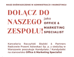 Kancelaria Raczyński Skalski & Partners Radcowie Prawni Adwokaci Sp. p. z siedzibą w Warszawie poszukuje Kandydata / Kandydatki na stanowisko Office & Marketing Specialist.