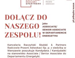 Kancelaria Raczyński Skalski & Partners Radcowie Prawni Adwokaci Sp. p. z siedzibą w Warszawie poszukuje Kandydata / Kandydatki na stanowisko Associate / Senior Associate do Departamentu Energetyki zarządzanego przez mec. Kacpra Skalskiego.