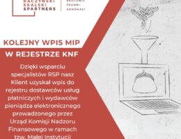 Uprzejmie informujemy, iż uzyskaliśmy kolejny wpis do rejestru małych instytucji płatniczych. W dniu 2 czerwca 2023 r. Komisja Nadzoru Finansowego dokonała wpisu trzech spółek z których jedna była reprezentowana przez zespół prawników kancelarii Raczyński Skalski & Partners Radcowie Prawni Adwokaci Sp. p. pod kierownictwem Mec. Macieja Raczyńskiego.