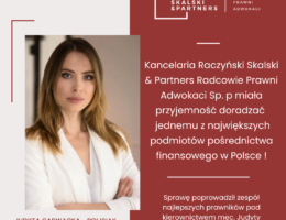 Kancelaria Raczyński Skalski& Partners Radcowie Prawni Adwokaci Sp.p miała przyjemność doradzać jednemu z największych podmiotów pośrednictwa finansowego w Polsce!